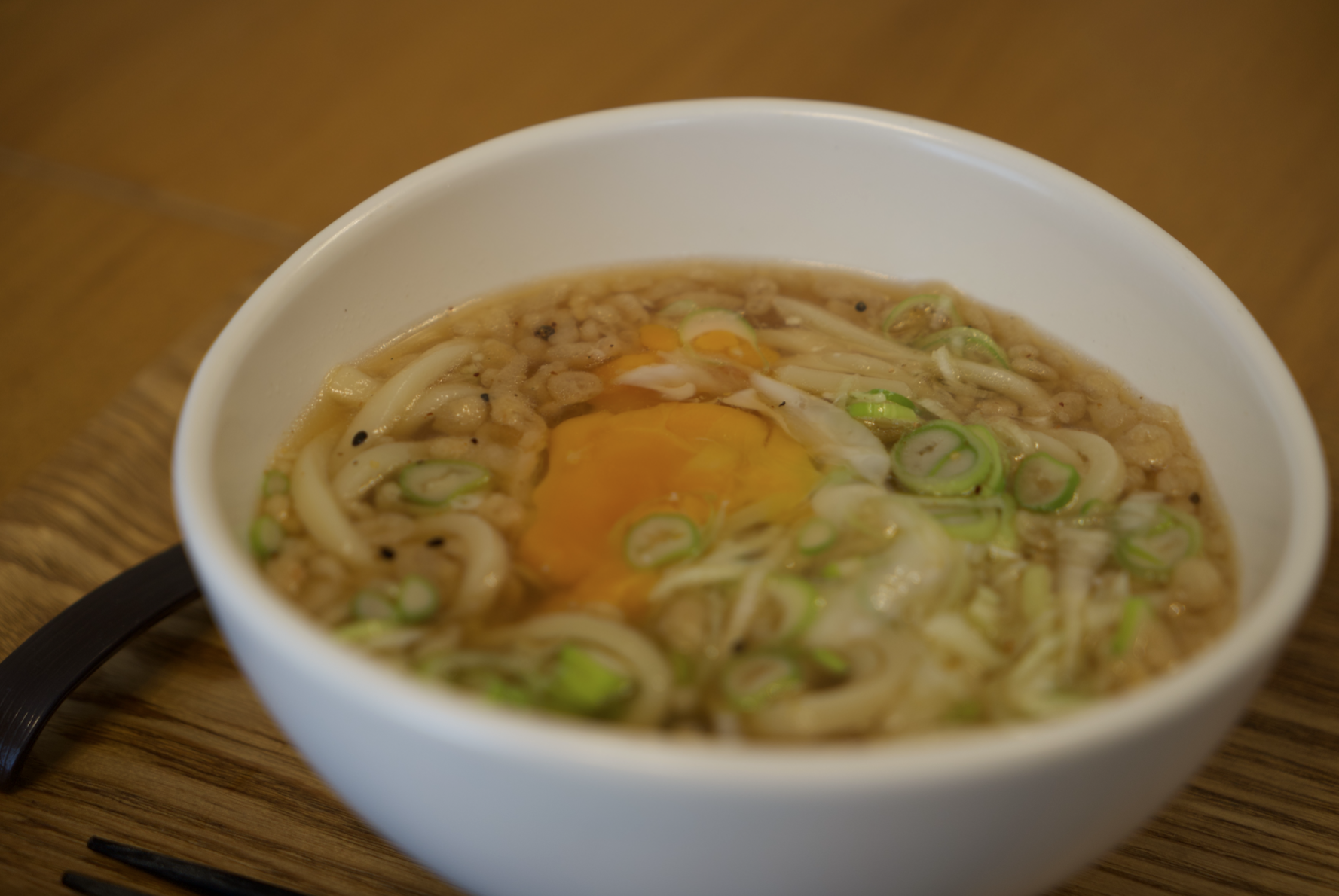 The preparation is also quite simple: place tempura bits on udon in hot broth, then drop a raw egg on top. Adding green onions or shichimi pepper to taste completes this flavorful dish.